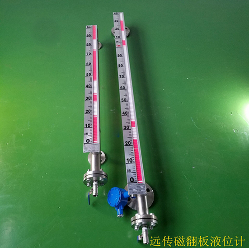 液位計根據浮力原理,浮子在測量管內隨液位的升降而上下移動,浮子內的永久磁鋼通過磁耦合作用,驅動紅、白色翻柱翻轉180’液位上升時,翻柱由白色轉為紅色,下降時,翻柱由紅色轉為白色,從而實現液位的指示。