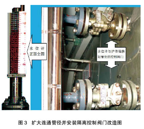將水位計(jì)與爐體之間連通管山原來(lái)的ch16mm更換為ch20mm的管段,并安裝兩個(gè)控制閥門(mén),通過(guò)關(guān)閉閥門(mén)(1)和(2),實(shí)現(xiàn)水位計(jì)與爐體隔離(l圖3)。這樣,拆卸水位計(jì)時(shí)既小需要排低爐水,也避免了對(duì)加熱爐真空度的影響。