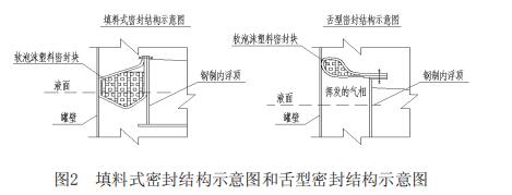 對比2種密封結構,填料式密封的優點是不存在氣相空間,缺點是在罐壁板為搭接結構中,隨著罐壁內直徑的縮小,容易出現卡盤現場;而舌型密封結構的優點是不存在卡盤現場,缺點是密封裝置下存在一定的蒸發空間,蒸發的耗損比填料式密封大。