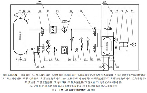油液供油:原理中油液經(jīng)吸油開關(30)、L 形三通電動閥(3、29)、油泵(4)、加熱器(5)、供油過濾器(6)、流量計(8)、L 形三 通 電 動 閥(11)后進入被測油箱,然后 經(jīng) L形三通電動閥(13)、油水換熱器(14)、回油過濾器(16)、L 形三通電動閥回到設備油箱中,此條支路可提供被測油箱剛安裝于試驗臺上時的油液供給,通過流量計軟件計時的方法判斷補油量。