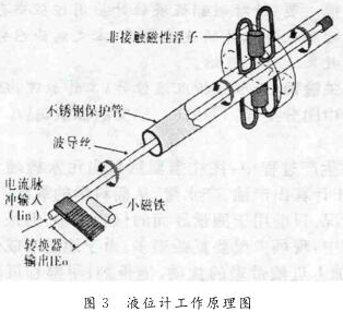 其工作原理是利用磁場脈沖波,測量時液位計的頭部發出電流“詢問脈沖”,此脈沖同時產生磁場,沿波導管內的感應線向下運行,在液位計管外配有浮子,浮子可隨液位沿側桿上下移動,浮子內設有一組永久磁鐵,其磁場與脈沖產生的磁場相遇則產生一個新的變化磁場,隨之產生新的電磁“返回脈沖”,測定“詢問脈沖”和“返回脈沖”的周期便可知道液位的變化。因此,磁致式液位計是以浮子為測量元件通過磁耦合的變化傳遞到指示器,使指示器能夠清晰地指示出液位的高度。