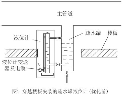 田灣核電3#、4#機(jī)組現(xiàn)場(chǎng)疏水罐液位測(cè)量*先采用兩個(gè)連通管把液位計(jì)測(cè)量筒與疏水罐連通,測(cè)量筒內(nèi)部含有磁浮子,磁浮子高度隨疏水罐內(nèi)液位變化,測(cè)量筒外部安裝測(cè)量桿,感受磁浮子高度,再通過(guò)下部變送器轉(zhuǎn)化成電流信號(hào)輸出到DCS系統(tǒng)。一些蒸汽管道安裝布置貼近地面,疏水罐穿越樓板,這樣就使液位計(jì)安裝后變送器位于樓板下部,即下一層廠房的房頂;如圖1所示。