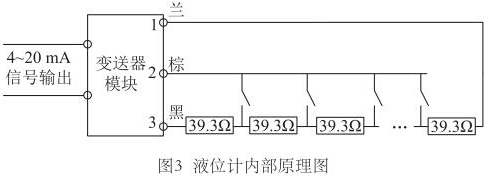 為尋求更好的改進(jìn)方案,對(duì)蒸汽夾套型磁翻板液位計(jì)的測(cè)量原理進(jìn)行了深入研究。液位計(jì)測(cè)量桿中是由等間距排布的干簧管和電阻元件組成,當(dāng)磁浮子達(dá)到某一高度時(shí),對(duì)應(yīng)的干簧管閉合,如果能識(shí)別出哪個(gè)干簧管閉合,即可獲得當(dāng)前液位值。那么變送器又是如何識(shí)別出哪個(gè)干簧管閉合的呢?再次探究測(cè)量桿內(nèi)部電路,繪制液位計(jì)內(nèi)部原理圖,如圖3所示。測(cè)量桿內(nèi)部電阻串聯(lián)連接,每?jī)蓚€(gè)電阻的連接處連接干簧管的一端,干簧管的另一端并聯(lián)連接,*終引出蘭、棕、黑三根信號(hào)線。