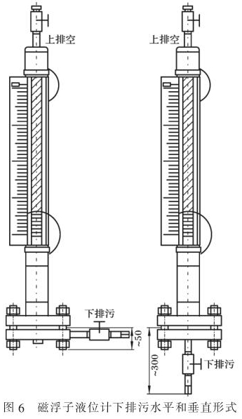 以常用防腐磁翻柱液位計為例。 此類液位計安裝時,一般選用側-側連接方式,帶放空和排污。因此, 應根據預留空間, 決定放空或排污采用垂直(常用)或水平的安裝形式,如圖 6 所示。