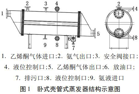 廣西某化工實業有限公司購進了四臺靖江容器制造有限公司生產的換熱面積為 26. 3 m3 的臥式殼管式蒸發器,廠家提供的結構示意圖見圖 1,主要用于冷卻乙烯酮氣體,要求四臺臥式殼管式蒸發器出口的乙烯酮氣體溫度依次為 - 5℃、- 10℃、- 15℃、 - 20℃,以分離出乙烯酮氣體中的水和醋酸,并防止結冰。
