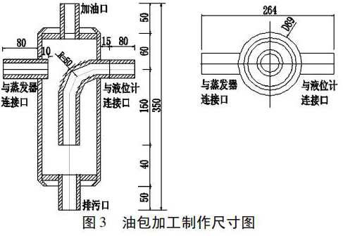 1. 現場加工制作油包。油包式液位計包括油包和防霜磁翻板液位計兩部分,通 過 管 道、閥 門 連 接 而成。油包是油包式液位計的關鍵部件,容積過小或與防霜磁翻板液位計連接不符合要求,有可能造成液位上升、下降緩慢,液位反應不靈敏,或者油包結霜。圖 3 為油包加工制作尺寸圖,現場加工按圖紙要求制作。