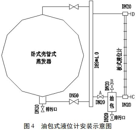 3. 安裝油包式液位計。根據現場的臥式殼管式蒸發器的實際情況,繪制了油包式液位計安裝示意圖( 圖 4) ,在排污口通向大氣、安全員現場監督的情況下,實施焊接、安裝。