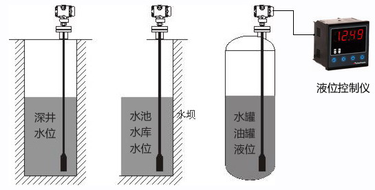 液位計應安裝在靜止的深井、水池中時,通常把內徑Φ45mm左右的鋼管(不同高度打若干小孔,以便水通暢進入管內)固定于水中,然后將靜壓投入式液位計放入鋼管中即可使用。變送器的安裝方向為垂直,投入式安裝位置應遠離液體出入口及攪拌器。在有較大振動的使用場合,可在變送器上纏繞鋼絲,利用鋼絲減震,以免拉斷電纜線。測量流動或有攪拌的液體的液位時,通常把內徑Φ45mm左右的鋼管(在液體流向的反面不同高度打若干小孔,以便水通暢進入管內)固定于水中,然后將靜壓投入式液位計放入鋼管中即可使用。 濕度傳感器探頭 , , 不銹鋼電熱管 PT100 傳感器 , , 下圖為不同工況下的投入式液位計的安裝方式: