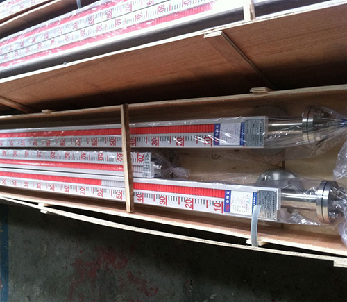 液位計根據浮力原理,浮子在測量管內隨液位的升降而上下移動,浮子內的永久磁鋼通過磁耦合作用,驅動紅、白色翻柱翻轉180’液位上升時,翻柱由白色轉為紅色,下降時,翻柱由紅色轉為白色,從而實現液位的指示。
