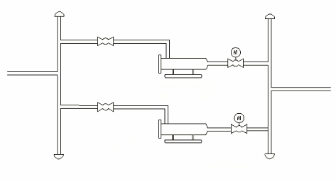 在輸氣站場根據下游用戶年設計輸氣量及檢維修需求通常設置兩臺臥式過濾分離器,運行時通常采用一用一備方式運行,氣量需求高峰時段達到單臺處理量時兩臺同時運行以滿足用戶氣量需求。過濾分離器在整個輸氣站場工藝流程中通過法蘭與管道相連,同時上下游均設置球閥(見圖1),其中下游球閥與電動執行機構相匹配使用,能實現遠程開關控制。在正常運行狀態下,在用過濾分離支路的上下游球閥處于完全開啟狀態,備用過濾分離支路的上游球閥處于開啟狀態,下游球閥處于關閉狀態。對于過濾分離器切換有兩種方式:一種是手動模式,另一種是自動模式。在手動模式下可由操作人員通過遠程和就地狀態下實現過濾支路流程切換;當在自動模式下電動閥產生事故關斷時,則報警并自動選擇備用設備,打開備用支路的電動閥,關閉當前支路的電動閥門,實現工作分離器和備用分離器的切換,上述過程由程序自動完成,不需人為干預。