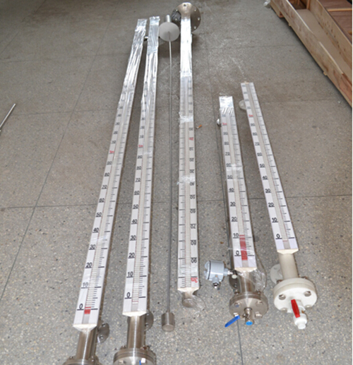 液位計根據浮力原理,浮子在測量管內隨液位的升降而上下移動,浮子內的永久磁鋼通過磁耦合作用,驅動紅、白色翻柱翻轉180’液位上升時,翻柱由白色轉為紅色,下降時,翻柱由紅色轉為白色,從而實現液位的指示。